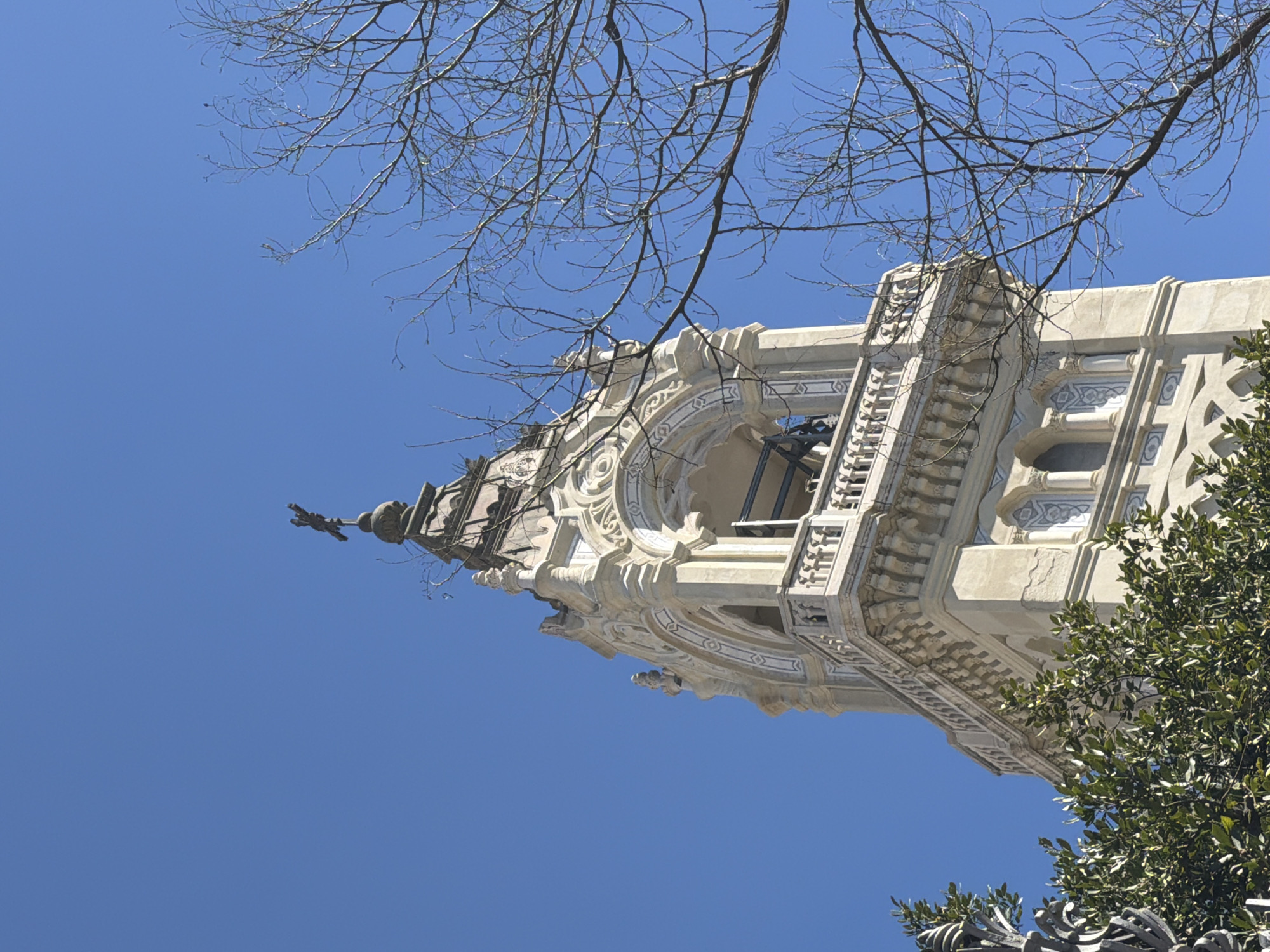 A low-angle, upward-facing photographic shot captures the ornate, multi-tiered bell tower of the Parroquia de San Manuel y San Benito, located at Calle de Alcalá, 83, Madrid, Spain. The tower is constructed from light-colored stone in a Neo-Mudéjar style, featuring intricate carvings, decorative arches, and balustrades. The visible portion of the tower's lower section includes arched panels possibly adorned with blue and white geometric patterns. Above this, a prominent balcony with a detailed balustrade and sculpted supports encircles the structure. Within the open belfry directly above the balcony, a dark-colored bell is partially visible. The tower culminates in a highly decorative spire, topped by a dark, metallic cross. The background consists of a clear, brilliant blue sky, indicating fair weather conditions. Bare tree branches with fine twigs extend into the frame from the upper right, partially obscuring the tower. In the lower left foreground, dense green foliage is visible, alongside a segment of a dark, ornate iron fence or gate. Bright sunlight illuminates the entire scene, casting subtle shadows that emphasize the architectural depth and detail. No individuals are present in the image.