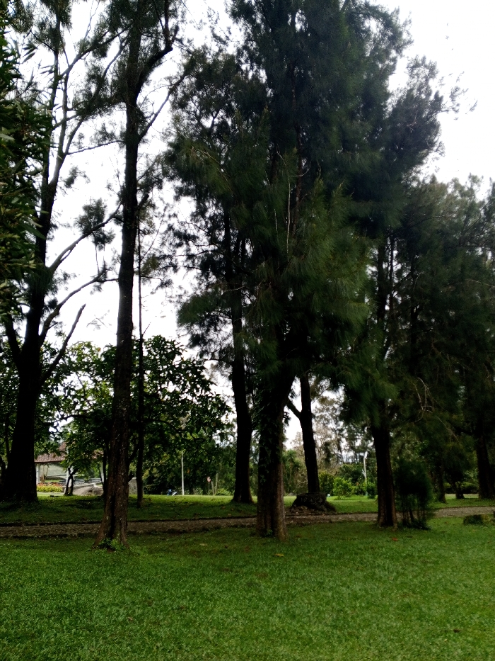 A park-like setting exhibits a lush, green lawn in the foreground. Multiple trees of varying sizes populate the scene, creating a layered composition. Some are tall and slender with bare trunks, while others are denser and evergreen. A building is visible in the background between the trees, suggesting a recreational area. The lighting is soft and diffused, indicating an overcast day.