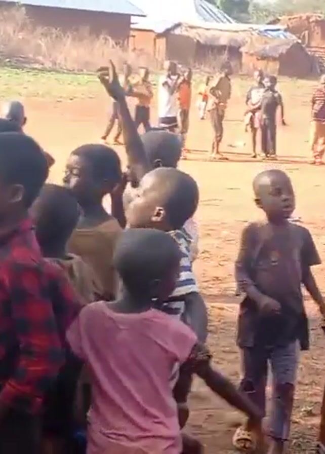 The video depicts a group of African children gathered outdoors, likely in a village setting, as evidenced by the visible structures in the background