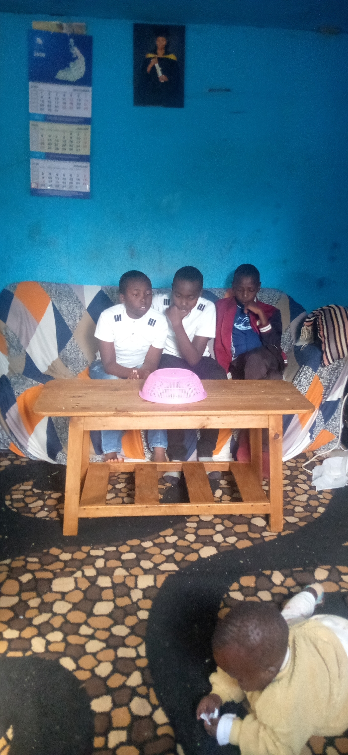 An indoor residential scene depicts four individuals within a room. The walls are a vibrant blue. On the left wall, three calendars are vertically stacked, with "2020" visible on the top calendar which also displays a map. To the right of the calendars, a dark framed image portrays a figure in a dark gown with a yellow stole, resembling graduation attire. Three young males are seated on a sofa against the blue wall. The sofa is covered with a patterned fabric in white, orange, blue, and dark geometric shapes. The male on the left wears a white short-sleeved shirt with black stripes on the shoulders and blue jeans, sitting barefoot and looking towards the front-right. The middle male wears a similar white shirt with black stripes and dark trousers, with dark socks on his feet, leaning forward with his right hand near his mouth and looking downwards. The male on the right wears a red jacket over a blue top and dark trousers, with dark socks, sitting with his right arm resting on his knee and left hand near his mouth, looking downwards. In front of the sofa is a light brown wooden coffee table with a slatted shelf. An inverted light pink plastic colander rests on the tabletop. On the floor in the foreground, a baby or toddler is positioned on their stomach, out of sharp focus, wearing a light yellow long-sleeved top and light-colored bottoms. The child holds a small white object in their right hand and is looking downwards. The floor is covered with a dark carpet featuring a distinctive light brown and black irregular "pebble" or "cobblestone" pattern. The location is an indoor residential setting in Unknown, Unknown.
