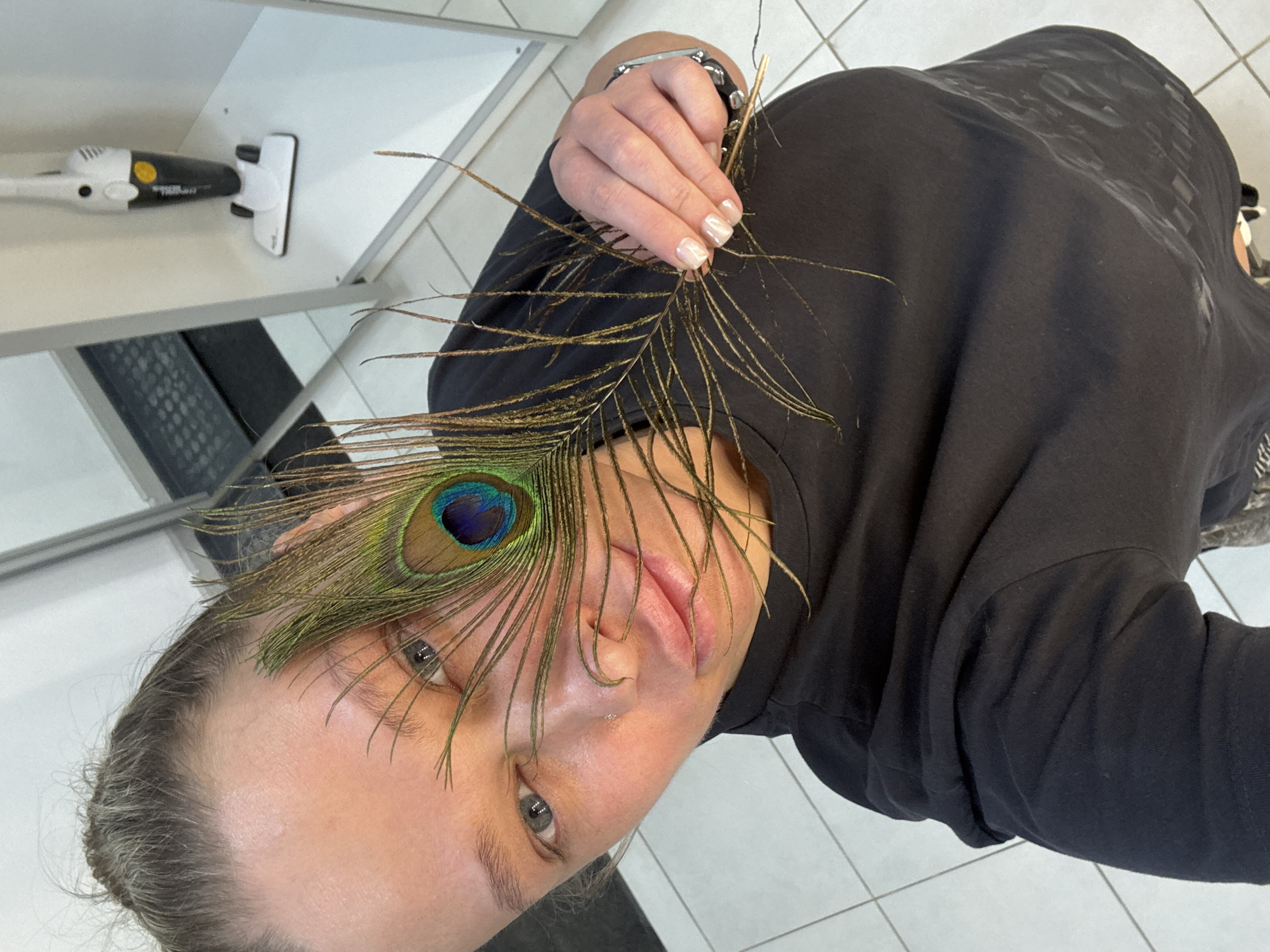 - "A woman holds a peacock feather close to her face in an indoor setting with white tiled flooring and white shelving" by FM-bUuVG2, licensed under CC BY 4.0