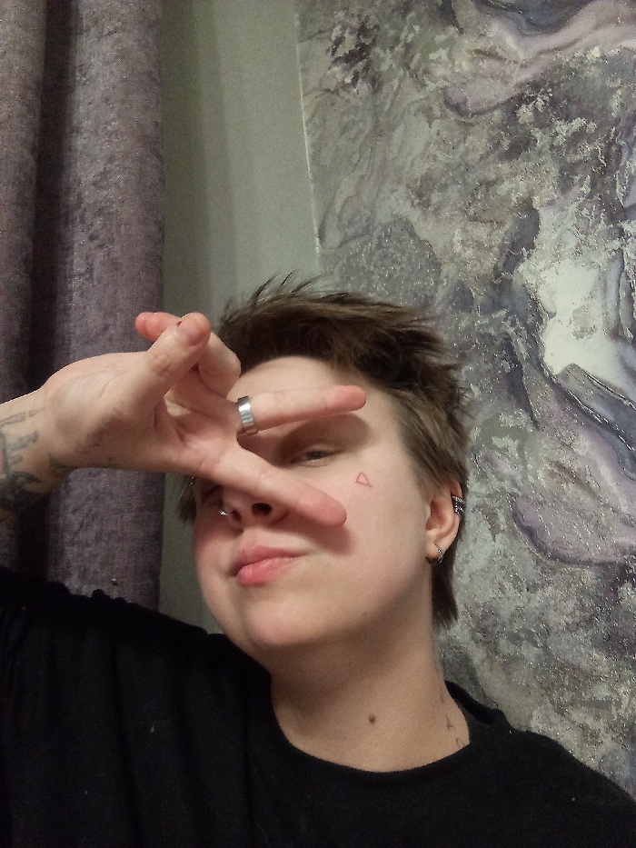 An individual is depicted indoors, looking directly at the camera. The person has short, light brown hair and a light skin tone. A silver-colored hoop nose ring is visible. On the right cheek, a small red outline of a triangle is present. The right ear displays multiple silver-colored earrings, including a cuff on the upper cartilage. The individual's left hand is raised, with fingers splayed in a V-shape, partially obscuring the lower face. A plain silver-colored band ring is on the left middle finger. The left forearm is visible and features dark-inked tattoos. The person is wearing a dark, possibly black, crew-neck top. The background behind the individual is vertically divided; the left side shows a dark grey, pleated curtain, while the right side features a wall covered in an abstract, marbled-patterned wallpaper primarily in shades of grey, purple, and white. The specific location within the city of Saratov, Russia, cannot be determined from the visual information provided in the image.