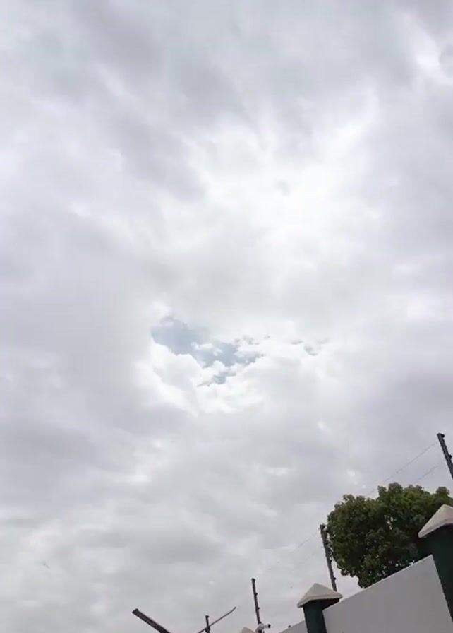 The camera, oriented vertically, pans upwards from a low wall to the sky. The wall is white with dark green vertical stripes on the columns. A barbed wire fence runs along the top of the wall, and a streetlight with solar panels sits next to the wall. Above, the sky is filled with thick, grey clouds with small patches of blue sky visible. As the camera pans upwards, the view broadens to show a road with traffic, including small, three-wheeled vehicles called auto-rickshaws, or "keke napep". Streetlights line the road. The overall impression is of a cloudy day in a busy urban area.