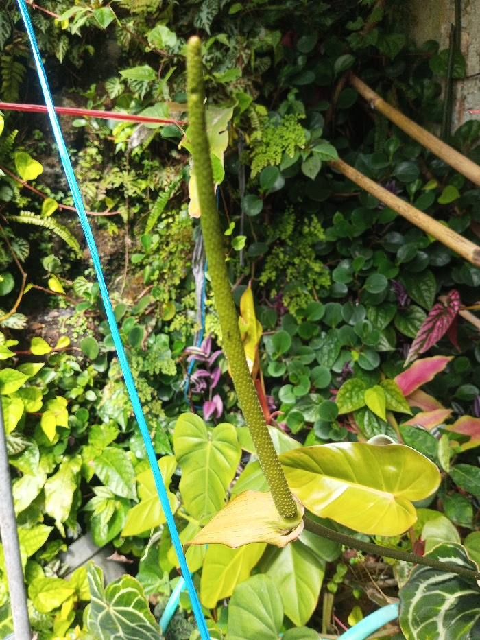 The image displays a detailed view of a lush garden environment situated in the city of Mindat, Myanmar. The central subject is a tropical plant featuring a prominent, erect, light green spadix, approximately 30-40 centimeters long, covered in small, textured protuberances. This spadix emerges from a pale yellowish-green spathe located near the bottom-center of the frame. The background consists of a dense arrangement of varied green foliage, suggesting a vertical garden or heavily planted wall. On the left side, lighter green, smaller-leaved plants are visible, while the right side shows darker green, round-leaved plants, along with some foliage exhibiting reddish-pink and variegated patterns. Man-made elements within the foliage include a bright blue rope or wire running diagonally downwards from the upper-left, a short segment of a red rope in the upper-left, and two light brown bamboo poles angled across the upper-right quadrant, likely serving as support structures. A gray vertical pole is partially visible on the far left, and a segment of a light blue hose or tube is present at the bottom-right. No individuals or animals are present. The scene is illuminated by natural, diffuse light.