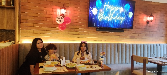 A family of three celebrates a birthday at a restaurant. A woman and two children sit at a table with plates of food, drinks, and balloons decorating the area. A TV screen displays a "Happy Birthday" message. Wall lighting, a brick-style wall, and a padded bench create a warm atmosphere.