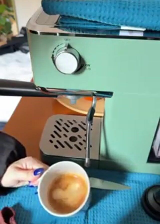 A person is adding frothed milk to a cup of coffee. A light green espresso machine sits behind the cup. A blue waffle-weave towel is draped over the top of the machine. The espresso machine has a black handle. A dial with the words “OFF” and “ON” is on the top left. The person is holding the cup of coffee with their left hand and a small metal pitcher with their right hand. The person has dark blue nail polish on. A maroon cloth and a paring knife sit next to the cup. A brown table is visible under the objects. The background is slightly out of focus.