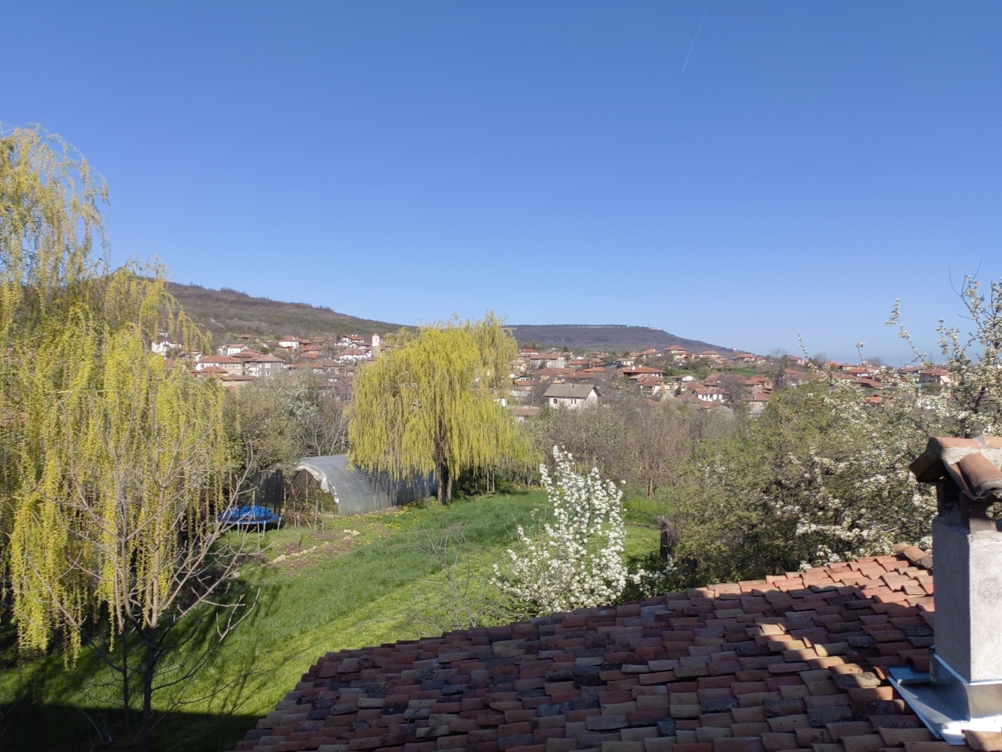 A sunny, clear day in Dragijevo, Bulgaria. The foreground features a tiled roof with a chimney, partially obscuring a view of a grassy slope. A weeping willow tree with yellow-green foliage stands to the left, casting a shadow. A greenhouse and a blue trampoline are visible in the middle ground. Beyond the slope, a settlement with red-roofed buildings extends toward a distant, wooded hill under a clear blue sky. A contrail is faintly visible in the upper right corner of the sky. The scene appears to be taken from an elevated position, possibly a higher building or hillside.