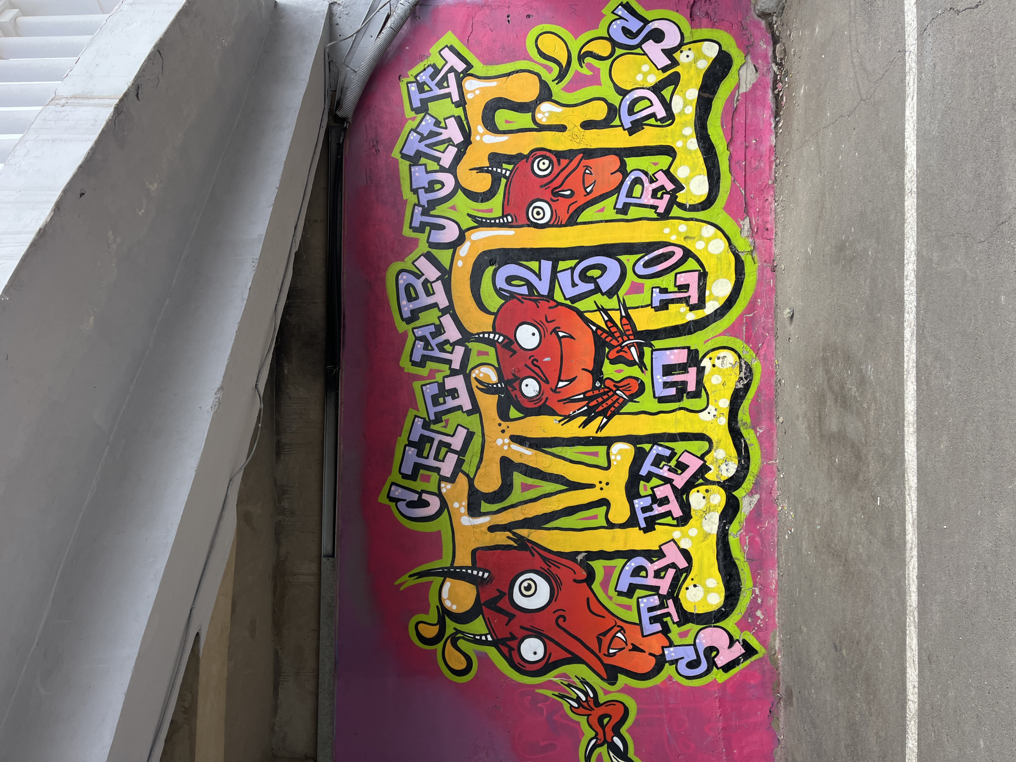 - "A vibrant graffiti mural adorns a weathered pink concrete wall beneath a grey concrete overpass or bridge structure in Krasnoyarsk, Russia" by FM-XhYFz1, licensed under CC BY 4.0