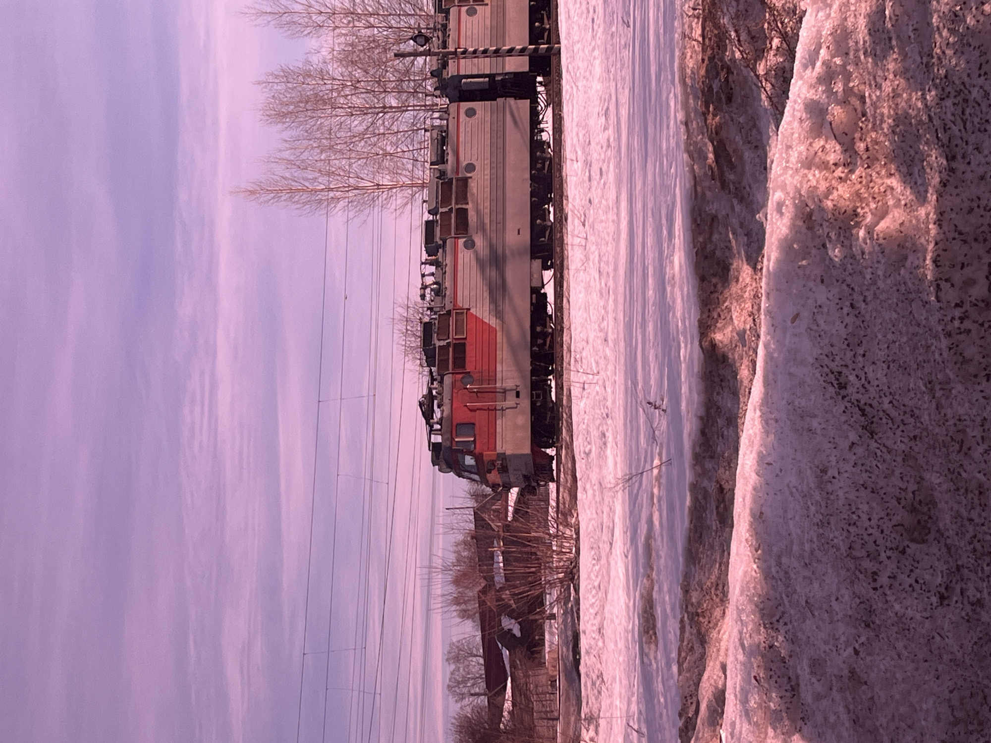 A wide-angle photograph taken in Kambarka, Russia, captures a winter landscape under a distinct pink and lavender sky. In the foreground, irregular mounds of snow, exhibiting patches of exposed dark earth and sparse, dry vegetation, stretch across the lower half of the frame. A two-section electric locomotive, painted in red and light gray, is positioned on a railway track running horizontally through the midground, appearing stationary or in slow motion. Overhead electrical lines for the train are visible against the sky. To the left of the locomotive, several rustic buildings with dark roofs are partially obscured by bare trees and brush beyond the tracks. Additional bare trees line the horizon, particularly on the right side of the frame. A vertical, striped pole is situated near the train on the right. No individuals or specific actions are discernible.