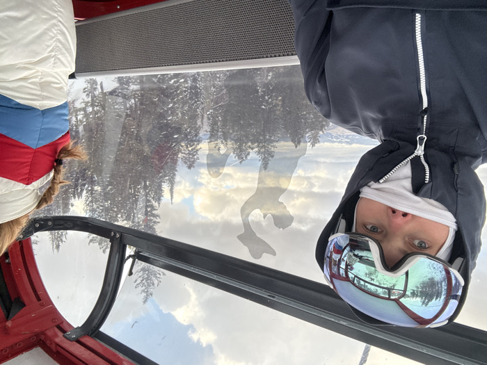 Inside a red and gray gondola, two people are seen against a backdrop of snowy trees and cloudy skies. One person, wearing a white puffy jacket with red and blue accents and light-colored braided hair, is on the left. The other person, wearing ski goggles and a dark hooded jacket, is looking directly at the camera. The reflection on the glass adds to the layered view of the winter landscape beyond.