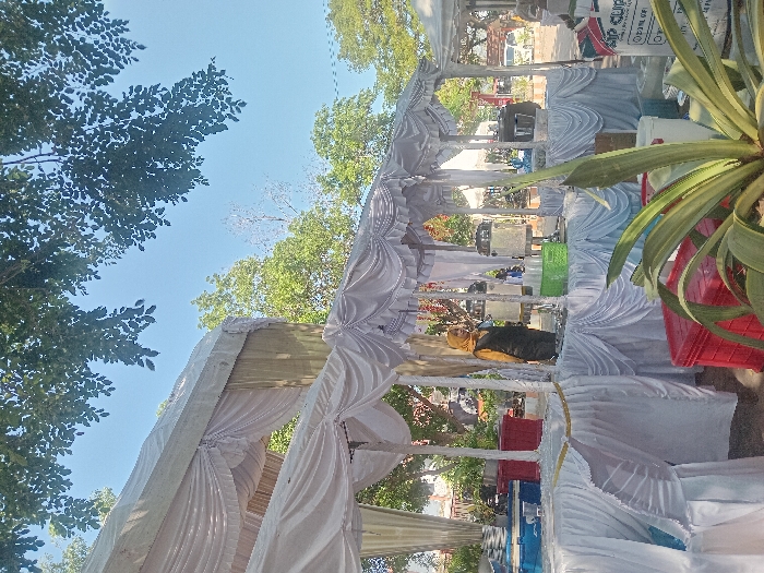 A white tent structure stands under a blue sky and green trees. The tent is draped in white fabric, creating a decorative covering. Inside, people are present, indicated by a figure wearing a hijab and other blurry shapes. Dispensers and containers are set up, hinting at a food or beverage service. A potted plant with large green leaves is partially visible on the right side, adding a touch of greenery to the scene.