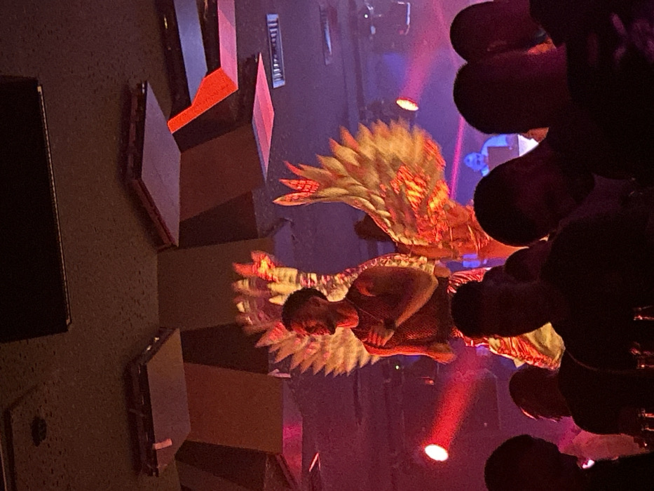The image depicts an indoor nightclub scene in Sofia, Bulgaria, characterized by dynamic stage lighting and a performing artist. In the center, a male performer with dark, curly hair and a beard stands elevated, likely on a stage. He wears a dark, possibly mesh, sleeveless top, light-colored patterned trousers, a necklace, and a watch on his left wrist. His left arm is bent, hand near his chest, while his right arm is obscured. He is adorned with large, ornate golden-colored wings, appearing feathered or structured, which extend widely behind and above him, reflecting the intense red and amber stage lights. He looks slightly to his left and upwards. Behind the performer, a bald individual, likely a DJ, is visible behind a console, illuminated by blue light, with a laptop present. Various stage lights are visible, including a prominent red spotlight originating from the left. The ceiling and upper walls feature dark, textured panels and angular, light-colored geometric structures, possibly acoustic panels, with some red accent lighting. The lower portion of the frame is filled with the silhouettes of a dense crowd, primarily adult males, facing towards the performer. Their heads and shoulders are visible in deep shadow, with hints of bottles on a surface in the immediate foreground. The environment is dimly lit by ambient club lighting, heavily saturated with red and purple hues from the stage illumination.