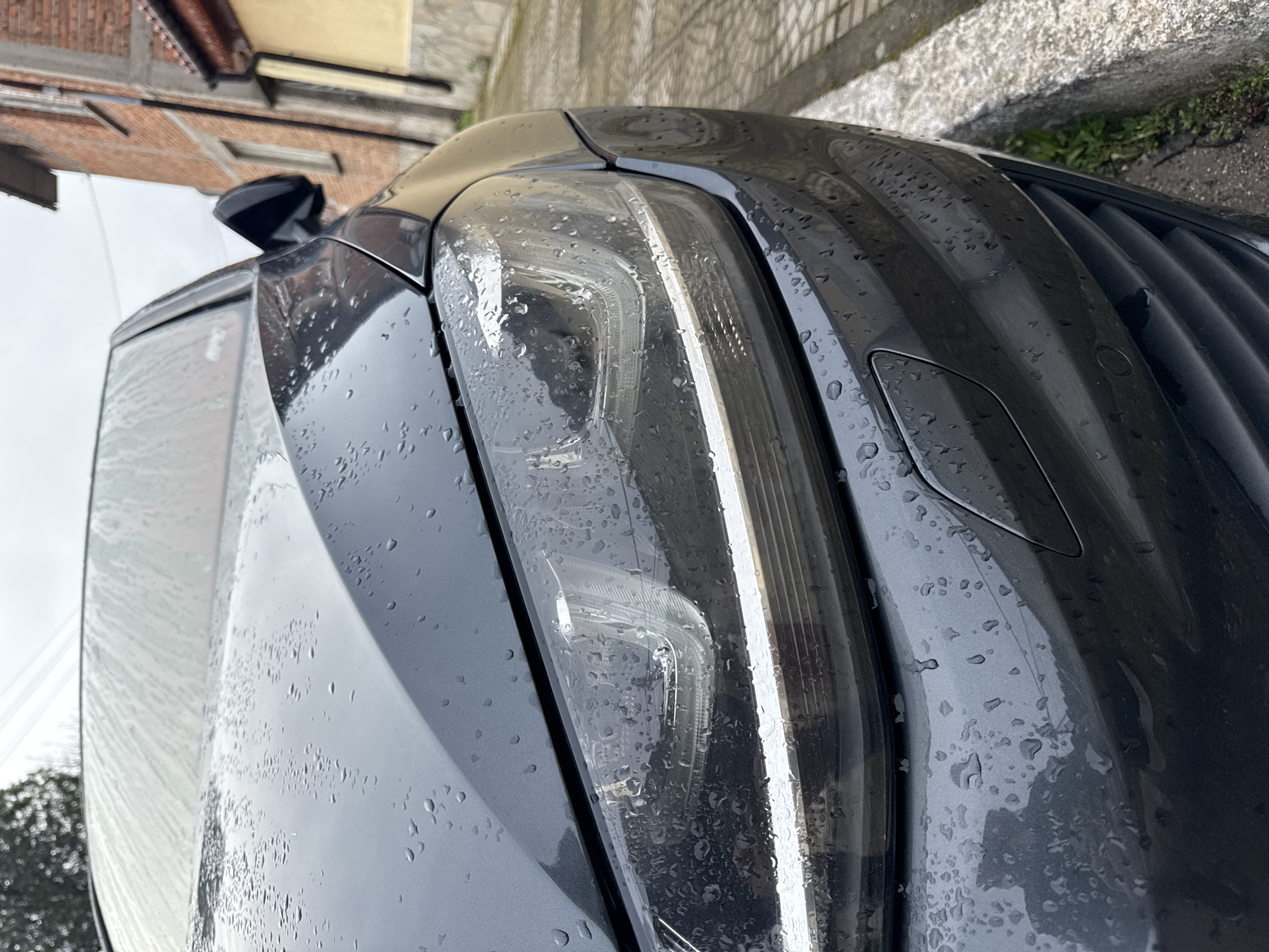 A close-up, low-angle photograph captures the front-right portion of a dark grey metallic passenger vehicle, consistent with a Volkswagen Golf, parked on a street in Dobrich, Bulgaria. The vehicle's hood, front fender, headlight assembly, and bumper are uniformly coated with numerous water droplets, indicating recent precipitation or condensation. The prominent LED headlight features distinct internal light elements. A visible parking sensor is located on the lower-right section of the front bumper. To the vehicle's immediate right, a concrete curb defines the edge of the parking area, adjacent to a paved surface composed of light-colored interlocking pavers. Sparse green vegetation grows in the narrow strip between the curb and the paved surface. The background reveals two residential-style buildings: one constructed of reddish-brown brick with a visible white window frame and brown fascia, and another with a pale yellow facade. The sky is overcast and grey, with faint outlines of bare tree branches and utility lines visible. No human subjects are depicted.
