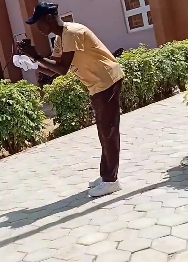 n outdoor scene with people walking around. The ground is covered in interlocking pavement stones. There are several trimmed bushes and trees. In the background, there is a building with windows and air conditioning units. The video appears to have been taken in bright sunlight. The people are wearing different styles of clothes, some in casual wear, one in a black robe and one wearing a white mask.