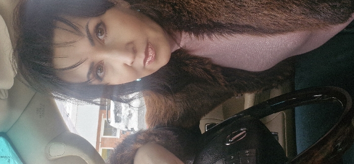 A woman with dark hair and brown eyes is positioned behind a car steering wheel. She wears a shiny pink top and a brown fur vest. Outside the car window, snow covers the ground and a red brick building is visible. The interior of the car is a neutral color, with a glimpse of green fabric in the background. The woman has a glossy lip color.