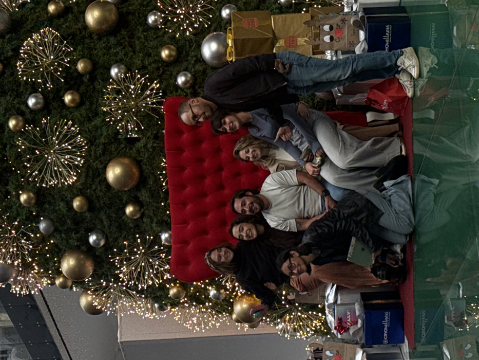 - "A group of eight people is lying on a red, tufted surface in front of a large Christmas tree" by FM-x6Qwo1, licensed under CC BY 4.0