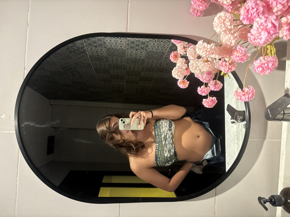 A person is visible in a mirror, holding a phone up to capture their reflection. The individual is wearing a patterned strapless top and what appear to be jeans. The bathroom features white tile walls and a patterned ceiling. To the right of the mirror are pink flowers, and a faucet and soap dispenser are positioned on the counter. The mirror reflects a darkened area with a horizontal yellow line.