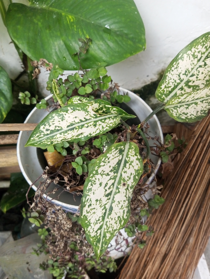 The scene depicts a close-up, top-down view of potted plants, situated in Khammam, India. The primary subject is an Aglaonema plant, also known as Chinese Evergreen, with large, ovate leaves featuring a distinct variegation pattern of bright green and mottled white. Two prominent Aglaonema leaves are visible, one in the lower center and another partially obscured to the left. The leaf in the lower center exhibits a small circular perforation. The plant is contained within a round, white ceramic pot with a visible rim, partially obscured by foliage. Within the pot, surrounding the base of the Aglaonema, are numerous smaller plants with small, round, vibrant green leaves, possibly a creeping groundcover. Interspersed among these are dried, dark brown plant stems and foliage debris. In the upper left background, a larger, solid green leaf with subtle yellowish markings, possibly from another plant such as a Pothos, is visible. Behind the pot, a white wall exhibits patches of dark green discoloration, suggesting moisture or organic growth. To the right of the potted plant, a dense bundle of dry, slender, light brown fibers, consistent with the bristles of a traditional broom, rests vertically. No individuals are present in the frame. The lighting suggests ambient daylight.