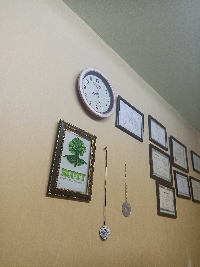 The image depicts an interior room in the city of Dahiyat Qudsaiya, Syria. A light beige/cream-colored wall dominates the frame, meeting a lighter, muted green-grey ceiling at the upper right. Mounted on the wall is a circular white-faced clock with a pinkish-white rim, displaying approximately 8:40. Below and to the left of the clock, a rectangular framed picture with a dark brown and gold frame shows a green tree design where the roots form the text "RCOTT open implant system." To the right of the clock, a cluster of approximately six to seven framed certificates or diplomas with dark frames are displayed on the wall. Below the framed picture, two decorative items hang vertically: one with a thin string ending in a circular medallion featuring a stylized skull, and another with a chain-like string ending in a grey, translucent ring. No individuals are present in the scene.