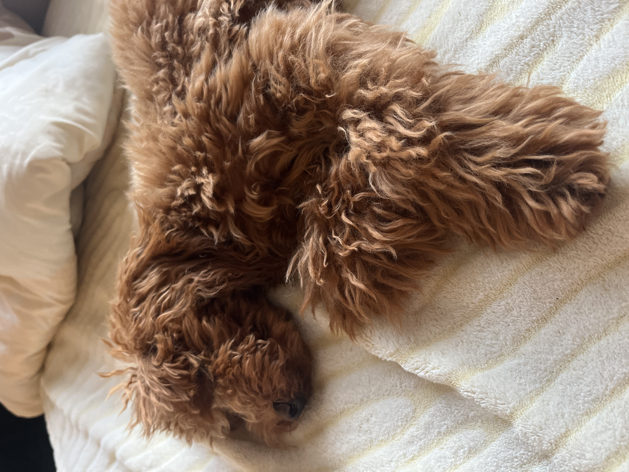 A close-up shot depicts a brown, curly-haired dog lying on a white blanket with faint yellow stripes