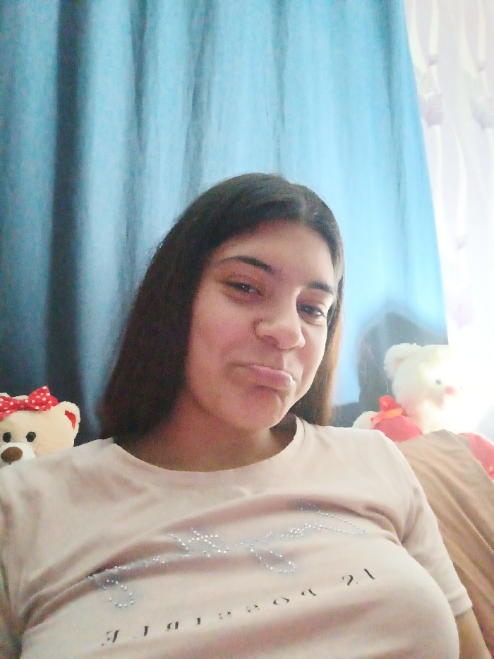 A female individual with dark, shoulder-length hair is depicted in an indoor, close-up shot, looking directly at the camera. She wears a light-colored t-shirt bearing the partially inverted text "I 'S POSSIBLE" in reflective embellishments. Her lips are pursed in a pout. To her left, a portion of a light-colored teddy bear with a red and white polka dot bow is visible. To her right, out of focus and partially obscured by a bright light source, another light-colored teddy bear with a red accessory is present. The background consists of a blue curtain, with significant illumination originating from the right side of the frame. The precise location within Roman, Bulgaria, cannot be determined from the visual evidence.