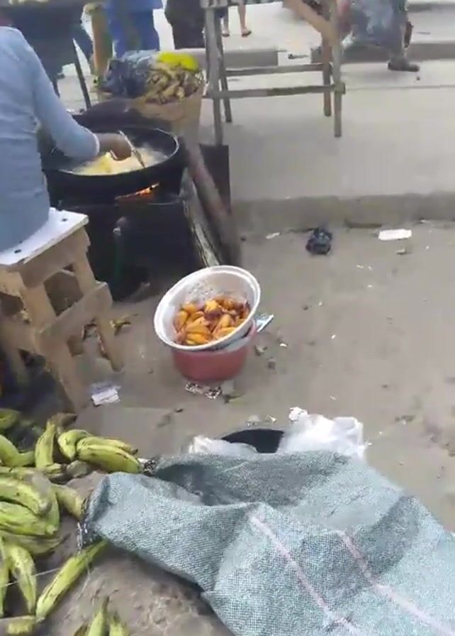 street vendor in a bustling outdoor market preparing what appears to be fried plantains