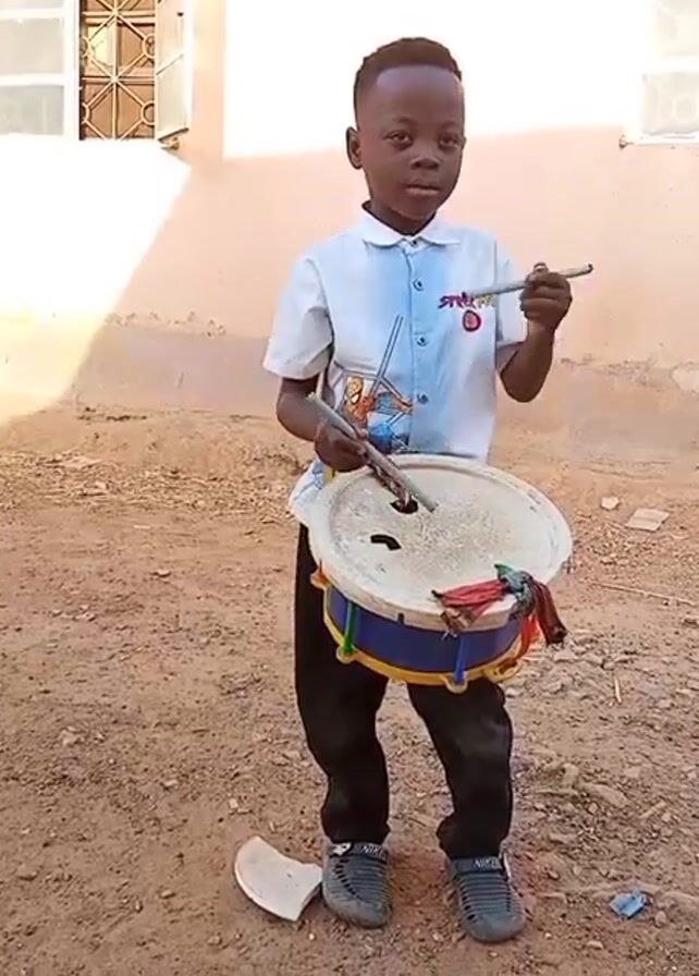A young boy stands outdoors on a dirt and gravel surface, holding a small, damaged drum with a blue and yellow frame, and what appear to be drumsticks made of metal rods