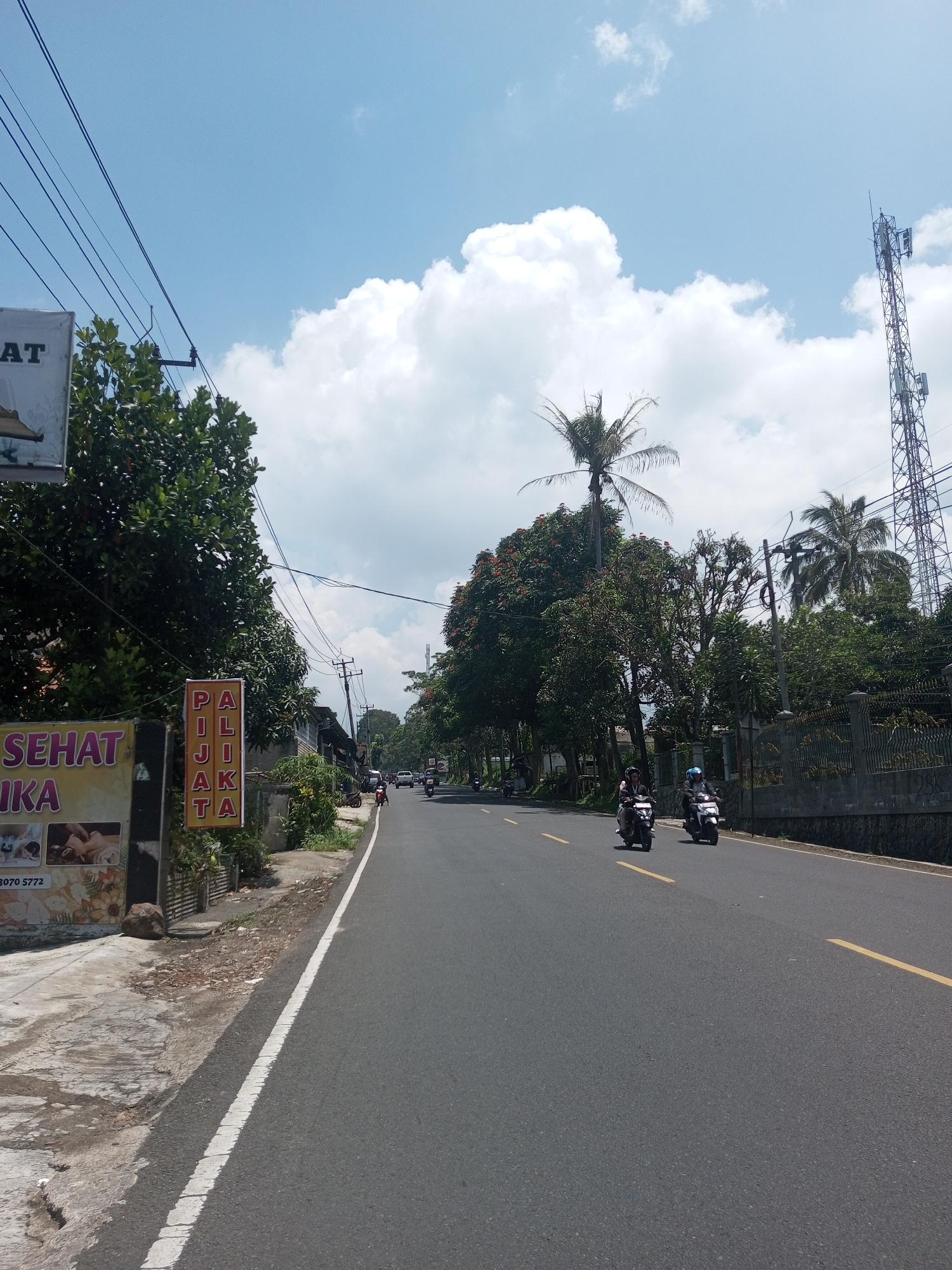 road in Nawng Hkar, Myanmar on a sunny day. The road is asphalt with a yellow dividing line and a white edge line. Two motorcycles are moving along the road. A person is walking on the left side of the road. Trees and vegetation line both sides of the road. A cell tower is visible in the background. Signs are present on the left side of the road, one reading "SEHAT" and another vertically arranged, "PILIJAKTA". Power lines are visible above. The sky is blue with white clouds. A low stone wall is present on the right.