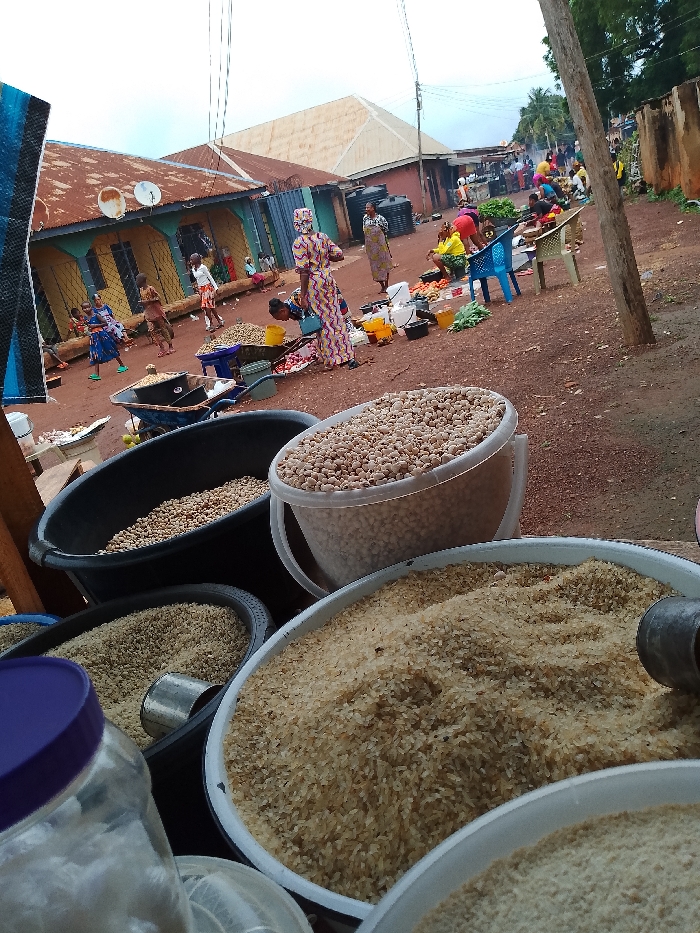 The image depicts a bustling outdoor market scene on a reddish-brown dirt ground, located in an unspecified city or town. In the foreground, several large containers hold bulk dry goods. A clear plastic bucket and a black tub are filled with light-colored legumes. Two white tubs contain rice grains, one of which includes a metal scooper. A clear glass jar with a purple lid is partially visible on the far left. The midground is populated by numerous individuals, predominantly women and children, engaged in market activities. A woman in a multi-patterned dress stands with her back to the viewer, slightly bent over items. Another woman, in a yellow top, is seated on the ground, tending to fresh produce, including red vegetables and green leafy items displayed on a mat. Other vendors and shoppers are visible throughout the area, alongside various market objects such as plastic chairs (one blue, one beige), buckets, and a blue wheelbarrow filled with produce. The background features a row of simple, single-story buildings with corrugated metal roofs. The leftmost building is painted teal with yellow door/window coverings and has two satellite dishes affixed to its roof. A black water tank is visible adjacent to one building. Utility poles with overhead wires extend across the upper portion of the scene. The sky is overcast.