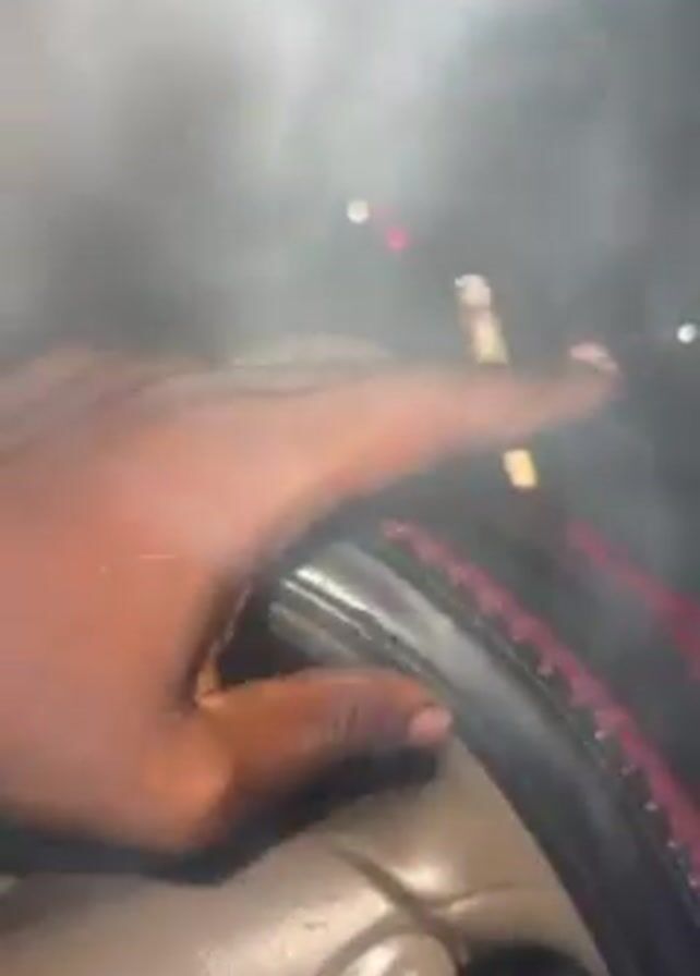 A person driving a Mercedes holds a lit cigarette between their fingers. The interior of the car is filled with smoke. The car is in park.