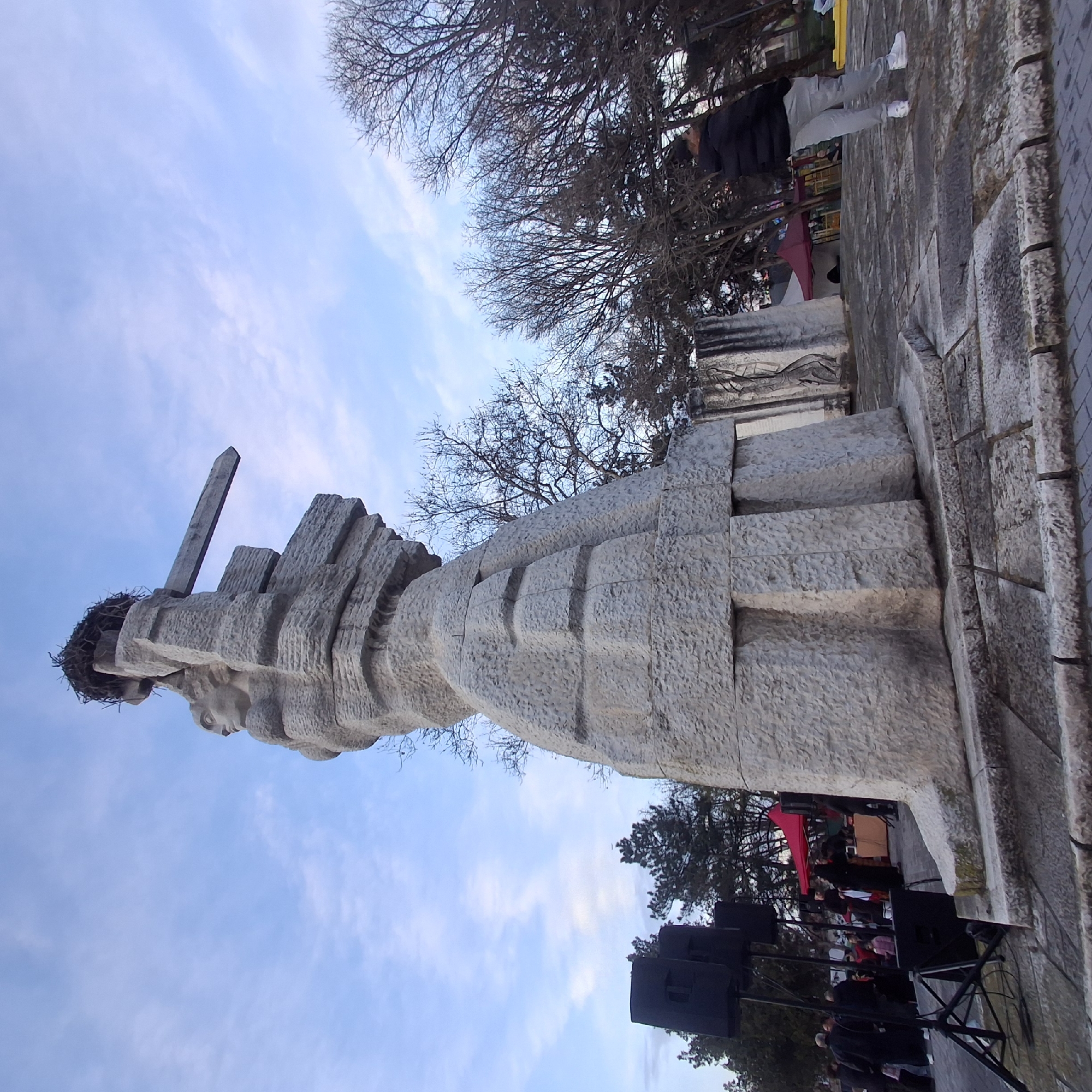 The image depicts a monument in Tsalapitsa, Bulgaria. The monument is a large stone sculpture of a man's head, possibly representing Jesus Christ, adorned with a crown of thorns. The sculpture is positioned against a backdrop of a light blue sky with wispy clouds. There are bare trees above the sculpture. On the right side, there is a stone structure or wall, along with a person in a black jacket and gray pants. Below the sculpture, a stage with speakers and audio equipment is set up. People can be seen in the area of the stage, suggesting a possible event or gathering is occurring.