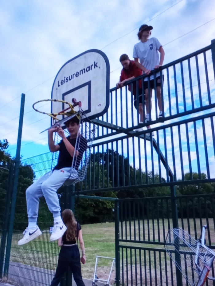 The image depicts an outdoor recreational area, identified as being in Wilkszyn, Poland. The scene centers on a white oval basketball backboard displaying the text "Leisuremark," with a damaged hoop from which a metal shopping cart basket is suspended, serving as a makeshift swing. A young male, wearing a black t-shirt, light grey sweatpants, white socks, and white sneakers, is seated on this improvised swing, looking towards the viewer while holding an object in his hands. Directly below him and slightly to the right, a young female, dressed in a black crop top and black pants, stands on the ground facing away from the viewer, looking towards the seated male. She holds a small reddish object in her right hand. Above and to the right of the seated male, two additional young males are positioned on the upper horizontal bars of a dark green metal fence structure. The male on the left, wearing a red long-sleeved shirt and dark shorts, leans forward on the railing. The male on the right, wearing a white t-shirt, dark shorts, and a baseball cap, stands upright. On the ground to the right of the female, two additional metal shopping cart frames or baskets are visible, one lying on its side. The background consists of green foliage from trees and grass, under a partly cloudy sky.