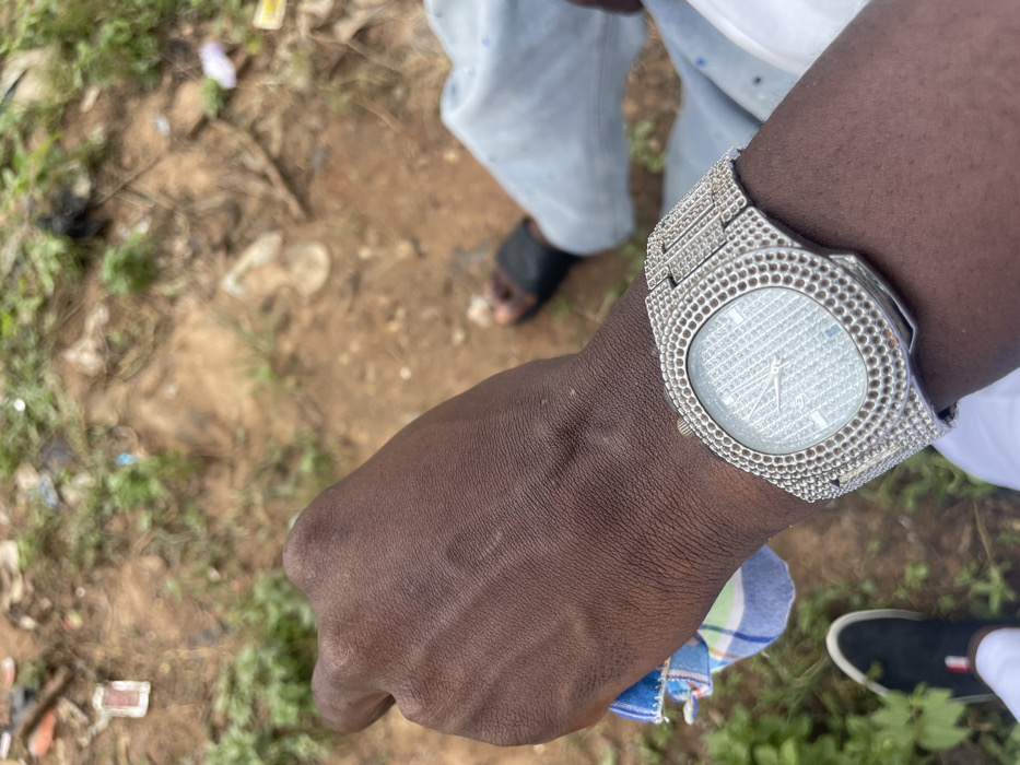 An overhead view in Karum, Nigeria, displays a dark-skinned forearm and hand, positioned centrally, wearing a silver-toned wristwatch heavily encrusted with clear gemstones on its bezel and full band