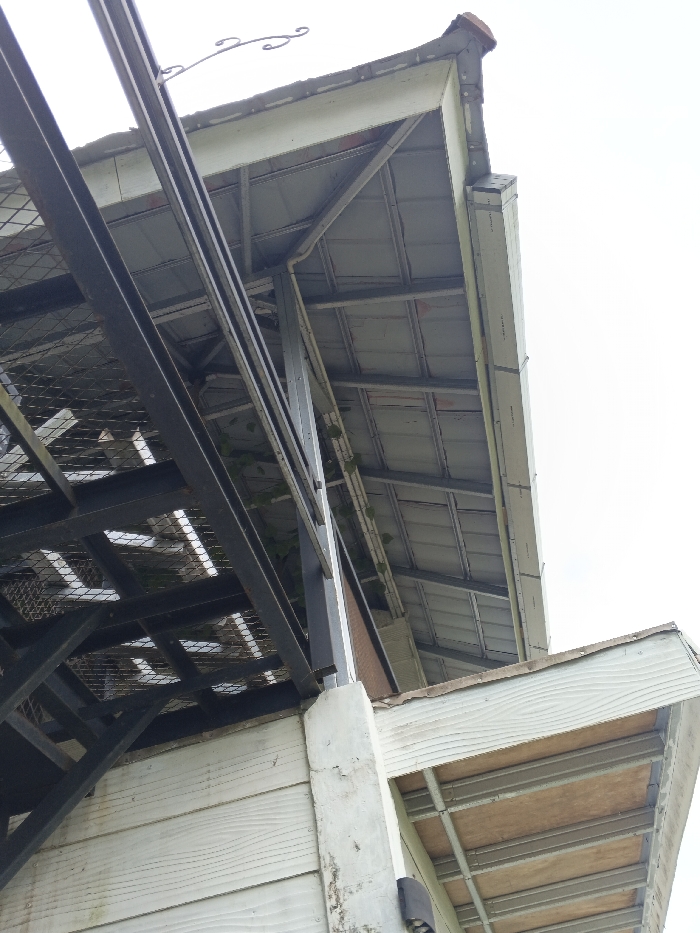 The scene is an upward-angled view of overlapping architectural structures against a bright, overcast sky in Man Gyat, Myanmar. In the foreground, a robust, dark-colored metal framework with an integrated mesh grid extends diagonally upwards from the left. Beneath this, a light-colored, horizontally paneled wall or fascia, showing signs of dirt and discoloration, is visible. A thick, light-colored vertical concrete or painted post supports the metal framework, with a small, dark rectangular object, possibly a light fixture, attached to it. Green vines with broad leaves are observed growing through the metal framework and along an interior column. To the right and further back, the underside of a roof structure is visible, composed of light-colored metal panels supported by a grid of light-colored metal beams. Its eave features a light-colored fascia board, and a single terracotta-colored roof tile is visible at the top right corner. A decorative, scrolled metal hook is affixed to the fascia board near the top center. In the bottom right, a lower roof or awning is visible from below, exposing light-colored plywood or particle board panels supported by a light-colored metal framework, with a matching horizontally paneled fascia. No individuals or specific activities are present in the image.