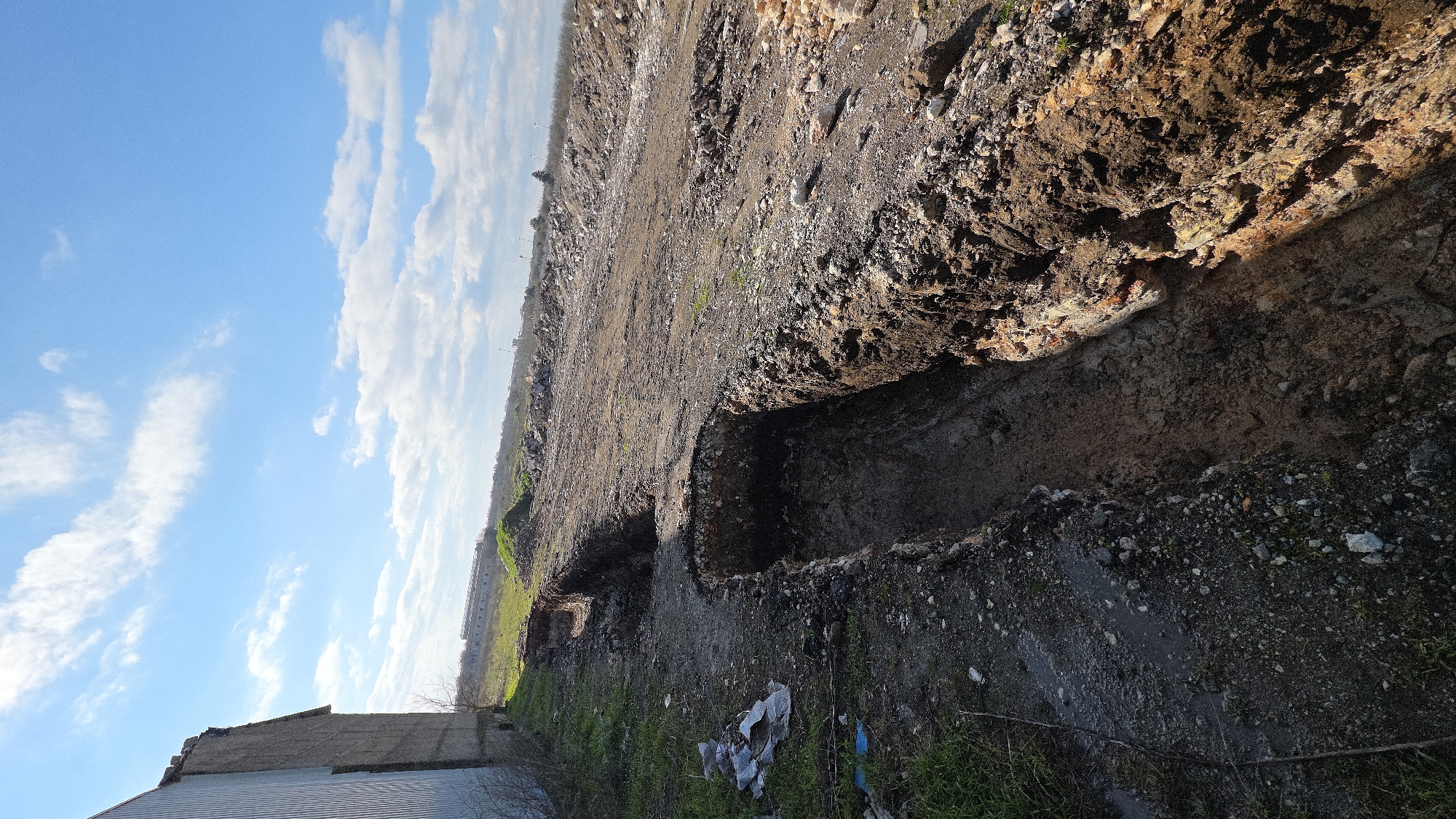 landscape in Balgarevo, Bulgaria, featuring a newly excavated trench or series of holes in the ground. The soil is brown and rocky. Debris, including plastic bags, are scattered near the edge of the excavation. In the background, vegetation is visible, transitioning to open terrain. A building partially appears in the lower left corner of the frame. The sky above is blue with scattered white clouds.