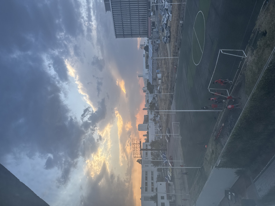 The image depicts an urban landscape in Puebla, Mexico, observed from an elevated vantage point, likely a building or balcony, during the transition from late afternoon to twilight. The sky is dominated by a complex cloud formation, featuring large masses of dark and light gray clouds. Patches of intense orange and yellow sunlight are visible on the horizon and breaking through cloud breaks, casting crepuscular rays. In the midground, an artificial turf soccer field is prominently featured. The field exhibits standard white markings, including a center circle and touchlines. Two white metal goal frames with netting are visible on the field; one is in the lower right, and another is positioned further back on the left. Approximately 6-8 individuals, predominantly male and wearing red shirts (some with visible numbers like '05') and dark shorts, are present on the field. Most are clustered near the goal in the lower right, appearing to engage in physical activity, possibly soccer practice or a casual game. Tall, white light poles are erected around the field's perimeter. The background showcases a mixed urban environment. To the left, a multi-story, light-colored building with numerous windows stands adjacent to a parking lot containing several vehicles. A large, unbranded metal billboard structure is centrally located behind the left side of the field. To the right, a prominent, modern multi-story building with a distinctive facade of vertical slats or panels rises, bordered by another parking area filled with numerous parked cars. In the far distance, a city skyline with various taller buildings is visible against the horizon. The intervening land includes undeveloped lots with sparse, dry vegetation and other less defined structures. The immediate foreground shows a dark, architectural edge and green foliage, likely from a building or railing.