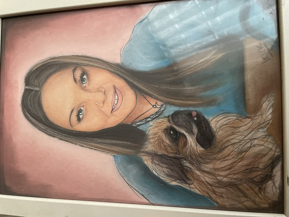 The image displays a photograph of a framed pastel or colored pencil drawing. The drawing depicts a young adult female and a small dog, rendered with a light pink background. The woman, positioned in the upper right and central portions of the drawing, has fair skin, blue eyes, long straight dark brown hair parted down the middle, and a smiling expression with visible teeth. She wears a small stud nose piercing on her right nostril and a light blue top. Around her neck is a dark cord necklace with a silver-colored crescent moon pendant. Her gaze is directed towards the viewer. To the lower left of the woman, a small, fluffy dog with brown and black fur, resembling a Pekingese, is depicted. The dog is positioned with its body facing left, head slightly turned, and a portion of its pink tongue protruding from its mouth. Its eyes are dark, and its fur texture is detailed. The background of the drawing is a uniform pale pink color, appearing slightly faded or graduated towards the top. Small reflective specks, possibly glitter or dust, are visible across the surface of the drawing or the protective layer over it. In the bottom right corner of the drawing, a signature or inscription, which appears to be "KICK" or similar, is present in dark lettering. The drawing is encased within a simple white rectangular frame. The frame shows minor surface wear, including some dust or smudges along its edges. The image is a photograph of this framed artwork, captured at a slight downward angle, suggesting it may be placed on a surface or leaning against something. The image itself is a photograph of a framed drawing. While the artwork depicts no specific geographic location within Troyan, Bulgaria, the physical framed drawing is presented, implying a potential location of display or possession within the city of Troyan, Bulgaria.