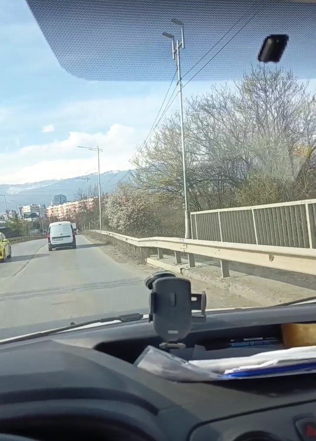 dashboard perspective from inside a vehicle driving on a roadway. There is a white van in front. Further ahead, the city is visible, with snow-capped mountains in the distance. There is a guardrail along the right side of the road and trees in the background. The sky is blue with some clouds. A cell phone holder is on the dashboard. Other cars are traveling in the same direction.