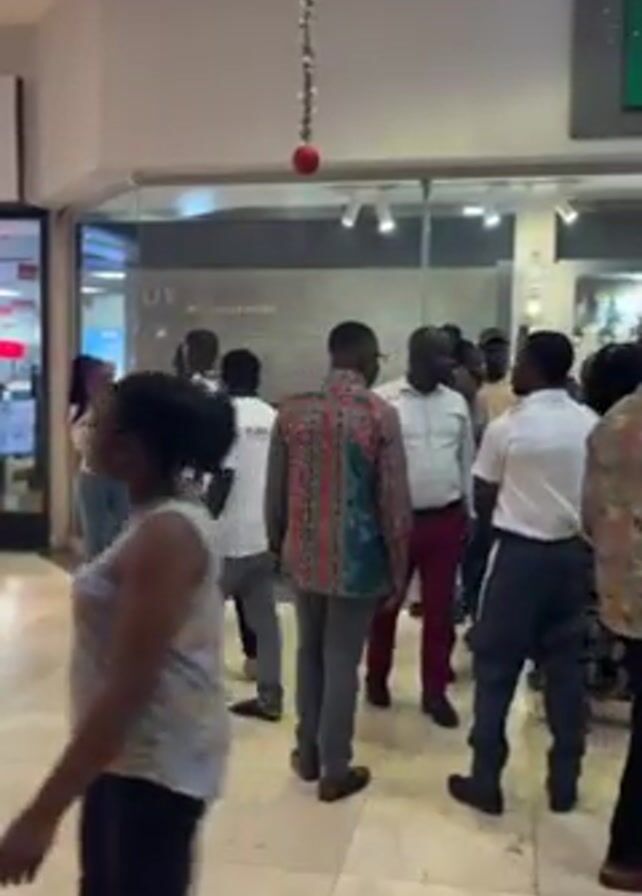 group of people gathered in front of a Hisense store in a mall. Most of the people are standing and facing towards the store, some seem to be talking to each other. The scene is decorated with Christmas lights. The mall floor is tiled. The atmosphere seems lively, and it is possible that the crowd is anticipating something happening at the store.