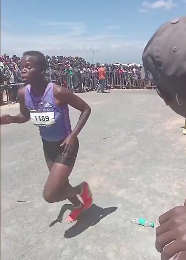 female runners participating in an outdoor race, with a large crowd gathered behind metal barriers to watch them. The race is taking place on a paved road under a clear blue sky with some clouds. The camera is positioned behind the crowd, offering a slightly elevated view of the racecourse. The focus shifts from one runner to another as they pass by. The runners are wearing athletic gear and bib numbers. A discarded water bottle lies on the ground near the camera. The people in the crowd seem to be cheering and watching the runners intently.