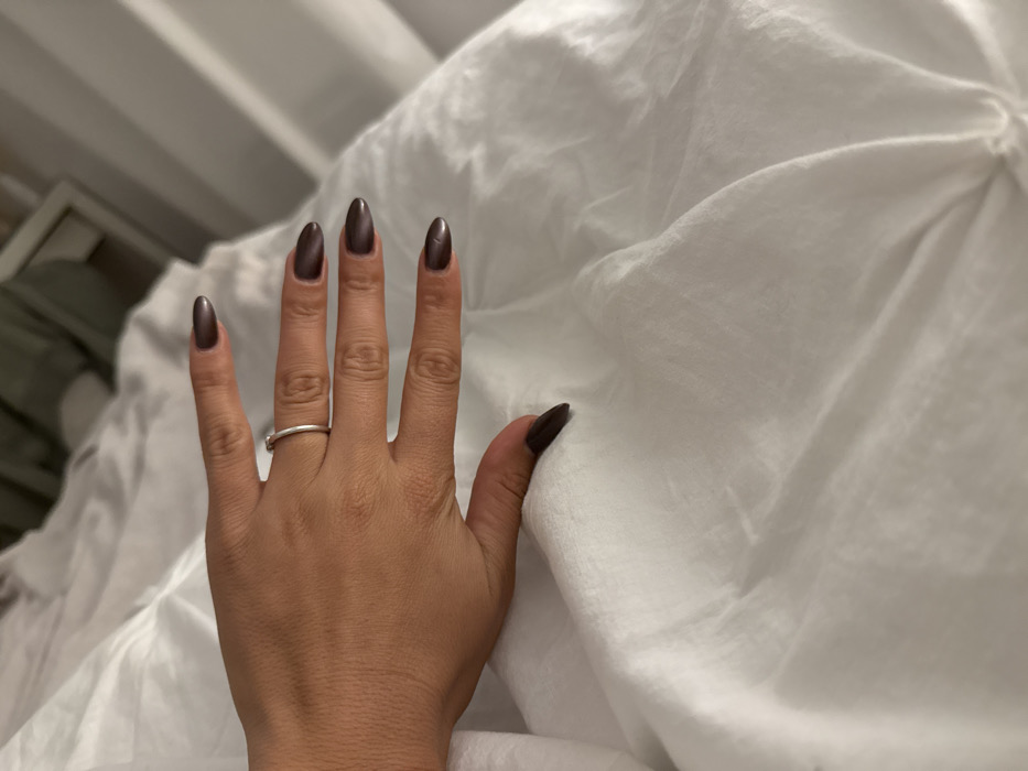 A tan-skinned hand with dark brown, almond-shaped nails rests on wrinkled white bedding. A simple silver ring adorns the ring finger. The hand is slightly angled, showcasing the palm and fingers against the backdrop of the soft, textured fabric. The lighting creates subtle shadows and highlights on both the hand and the bedding. A glimpse of a shelf can be seen in the background.