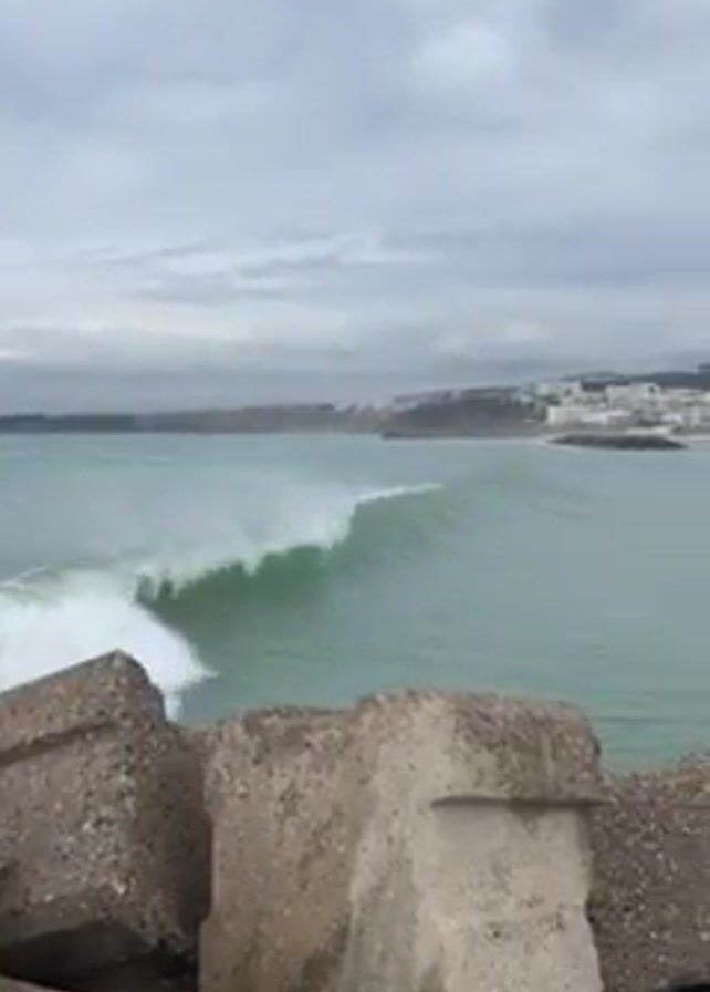 wave breaking in a body of water, from the perspective of a rocky shoreline. The wave is a turquoise color, with white foam as it crests and breaks. In the background, across the water, there is a city with a beach, with a notable white building. The sky is overcast with grey clouds. The foreground consists of large, grey concrete blocks. The camera pans slightly to the right as the wave progresses towards the shoreline.