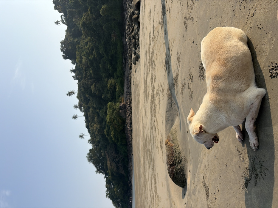 A light-colored dog stands on a sandy beach near a forested area. The dog faces downward, seemingly investigating the sand. To the left, lush green trees cover a hillside, dotted with palm trees. The sky is a clear, pale blue. The beach sand has varying shades, indicating wet and dry areas, and the presence of natural features. The overall scene depicts a serene coastal environment.