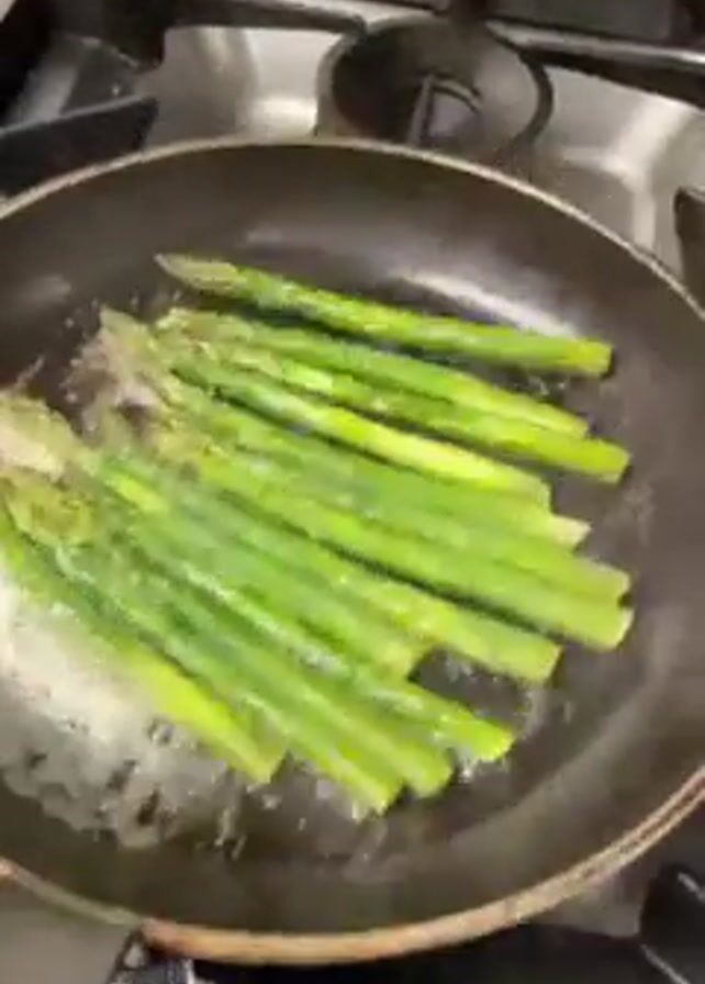 A close-up shot shows asparagus being sauteed in a pan on a gas stovetop