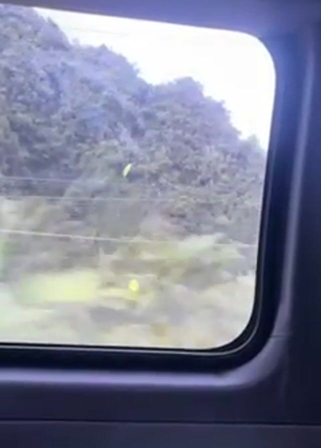 view out of a train window. Lush green foliage and trees are visible, and in the distance, a forested hill rises. The train appears to be moving at a moderate speed. The sky is overcast and bright. The window frame is dark gray.