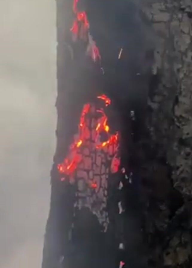 fire burning in a vertical crevice in a dark, rough surface