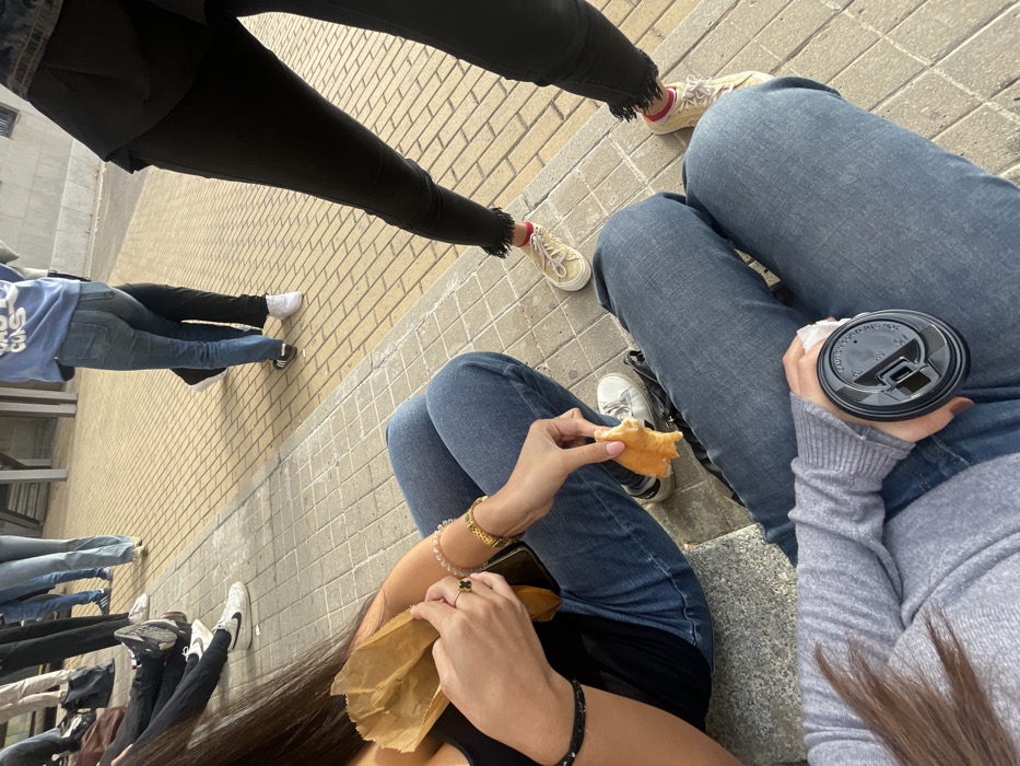 A daytime photograph captures an outdoor urban scene in Madrid, Spain, focusing on a group of individuals in a pedestrian area with a concrete seating ledge. In the immediate foreground, two individuals are seated on a grey concrete step. The person on the left, wearing blue jeans and a black top, holds a light brown paper bag in their right hand and a partially eaten yellowish-orange pastry in their left hand. This individual wears a black bracelet on the left wrist, a gold-colored bracelet, and rings on the right hand. White sneakers are visible near their feet. Next to them, a second seated individual, wearing blue jeans and a grey long-sleeved top, holds a black lidded coffee cup in their lap. In the midground, to the right, a third individual stands, wearing black skinny jeans with frayed cuffs and light yellow/beige canvas sneakers with red socks. Further in the background, multiple other individuals are visible, primarily from the waist down, standing or walking on a yellowish-beige tiled pavement. Their attire includes various blue jeans, black pants, and light-colored pants, with an assortment of white, black, and light-colored sneakers. One person in the background is wearing a light blue sweatshirt and blue jeans with contrasting black and white sneakers. The environment consists of a grey concrete seating area bordered by yellowish-beige pavement. No specific Madrid landmarks are identifiable.