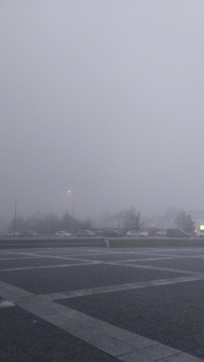 The image depicts a heavily fog-laden urban environment in Bischheim, France
