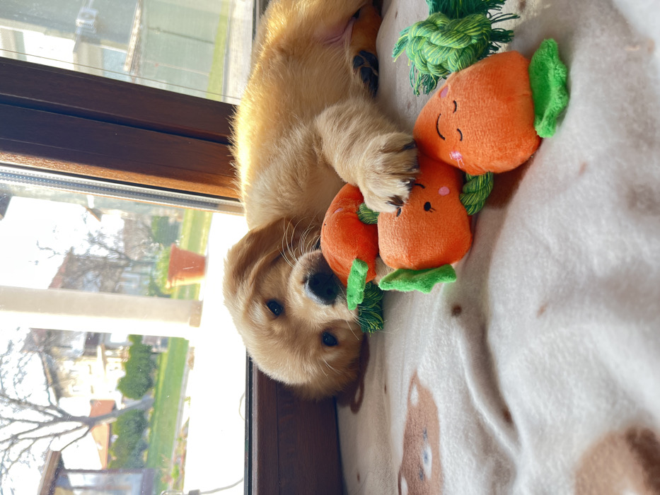 - "A golden retriever puppy, light golden-brown in color, lies on a patterned fleece blanket next to a window" by FM-lpmjW2, licensed under CC BY 4.0