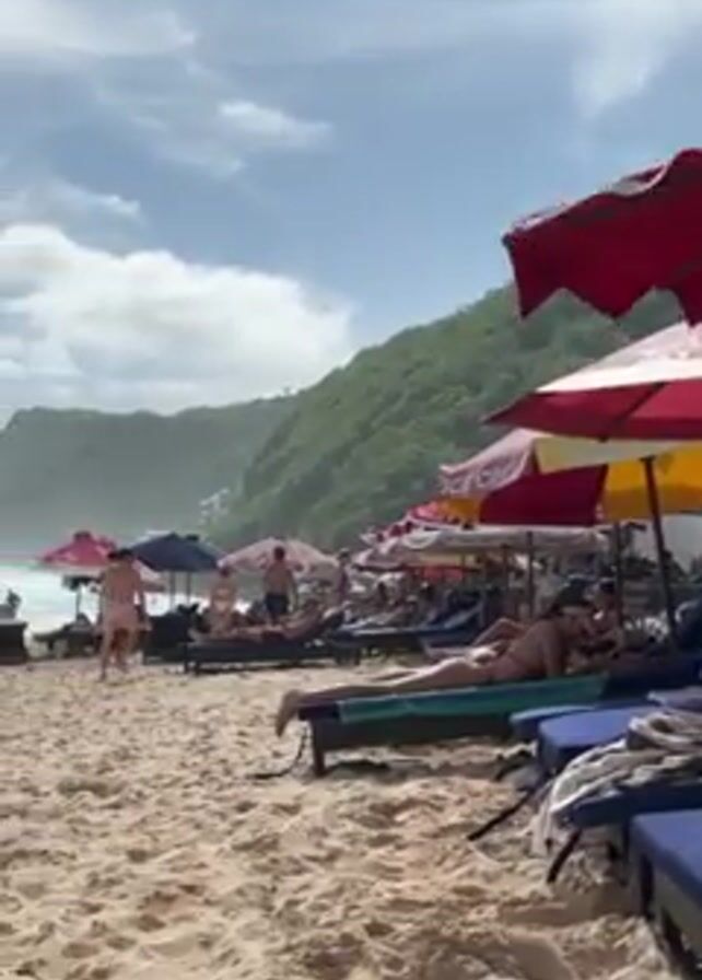 The scene shows a beach crowded with people enjoying a sunny day. Numerous beach umbrellas, predominantly red and yellow, dot the landscape, providing shade for lounge chairs occupied by sunbathers. Some people are partially visible in the water. A man in black shorts walks across the sandy beach towards the ocean. The water appears turquoise, and waves break in the distance. A lush, green cliff or hill serves as the backdrop to the beach, partially obscured by clouds.